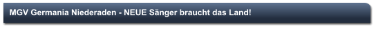 Wir brauchen Dich! – Ja…… genau Dich!Ein Männerchor lebt in jeder Zeit vom Nachwuchs. Wenn Du also gerade den Stimmbruch durchlebt hast, dann nimm Deinen Vater an die Hand und komme gemeinsam mit ihm am Dienstagabend zur Chorprobe. Unternehmt doch mal etwas zusammen! Stehst Du kurz vor der Rente und hast Angst vor den neuen Aufgaben, die Dir Deine Frau anheftet?Dann nichts wie hin - zum MGV – Germania - Niederaden!Keine Panik! Du musst nicht vorsingen!Sofern Du in der Badewanne singend noch nicht auffällig geworden bist und die Nachbarn bis dato noch nicht die Polizei wegen Ruhestörung gerufen haben, hast Du eine gute Chance, dass eine von 4 Stimmen die richtige für Dich ist. Was erwartet Dich? Wir, der MGV - Germania - Niederaden pflegen das Liedgut für Männerchöre im vierstimmigen Chorgesang. Die instrumentale Begleitung durch Piano und auch manchmal durch Kontrabass geben den Stimmen die Stärken, einen guten Klang zu hinterlassen. Neben dem Gesang findest Du die Integration in eine Dorfgemeinschaft, wie sie seit Jahrhunderten im Dorf gepflegt wurde. Wir organisieren neben unseren musikalischen Darbietungen Freizeitfahrten, Großveranstaltungen wie den traditionellen „Vatertag“.Also, auf was wartest Du? Wir brauchen Deine Unterstützung und verhelfen Dir zum Spaß in Deiner Freizeit!Dein MGV - Germania - Niederaden
